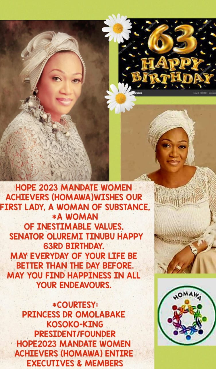 *Happy birthday to Senator Oluremi Tinubu, the first lady of Nigeria and a distinguished lawmaker.You are a woman of many achievements, a role modelfor many, and a source of inspiration for all. You have served your country with passion,integrity, and excellence, and you have made a positive impact on the lives of millions of Nigerians.